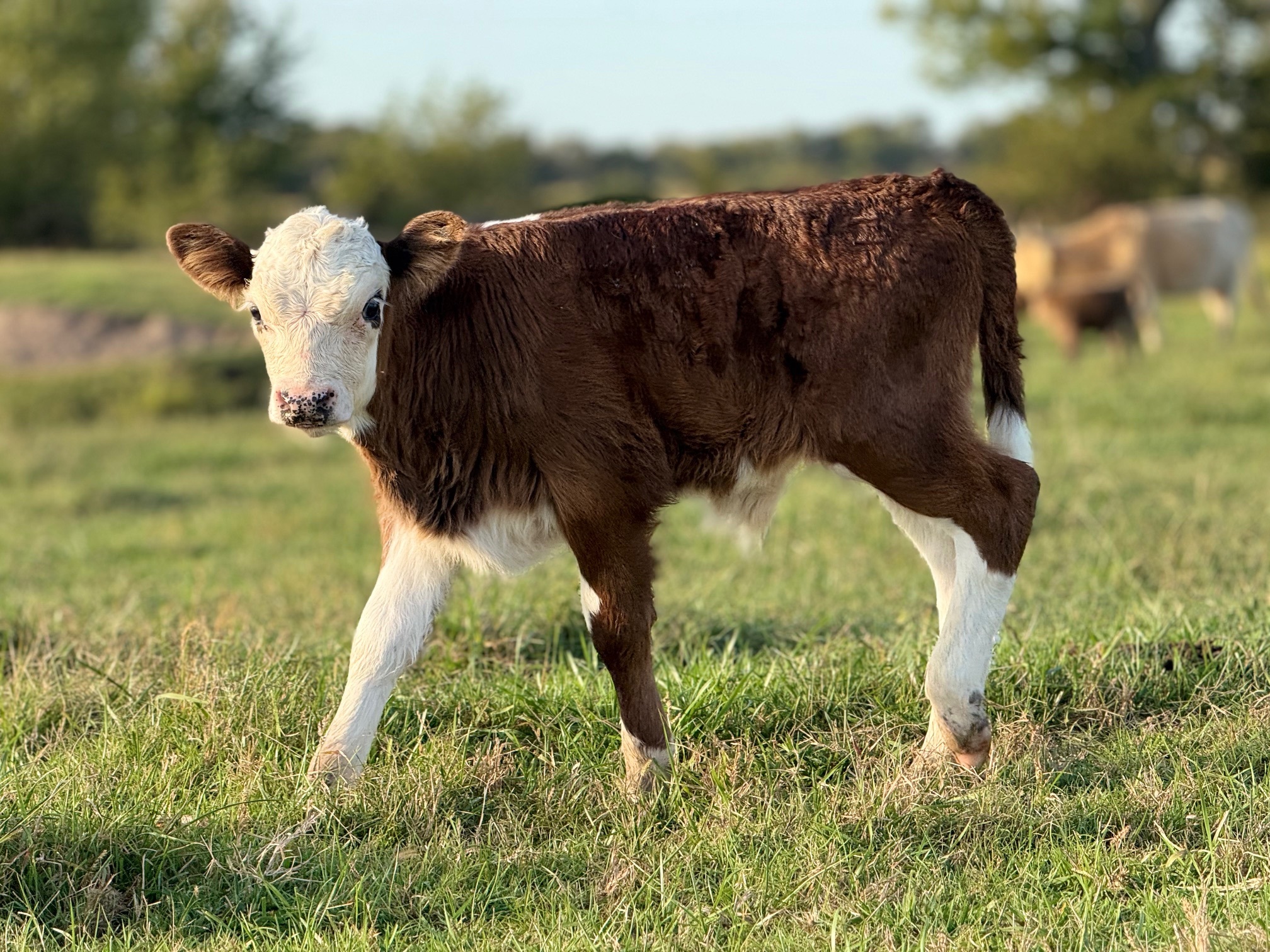 Her markings are absolutely eye-catching…most notably her distinct black patches around her eyes giving her that classic panda look and loads of personality. She’s the kind of calf that turns heads immediately.